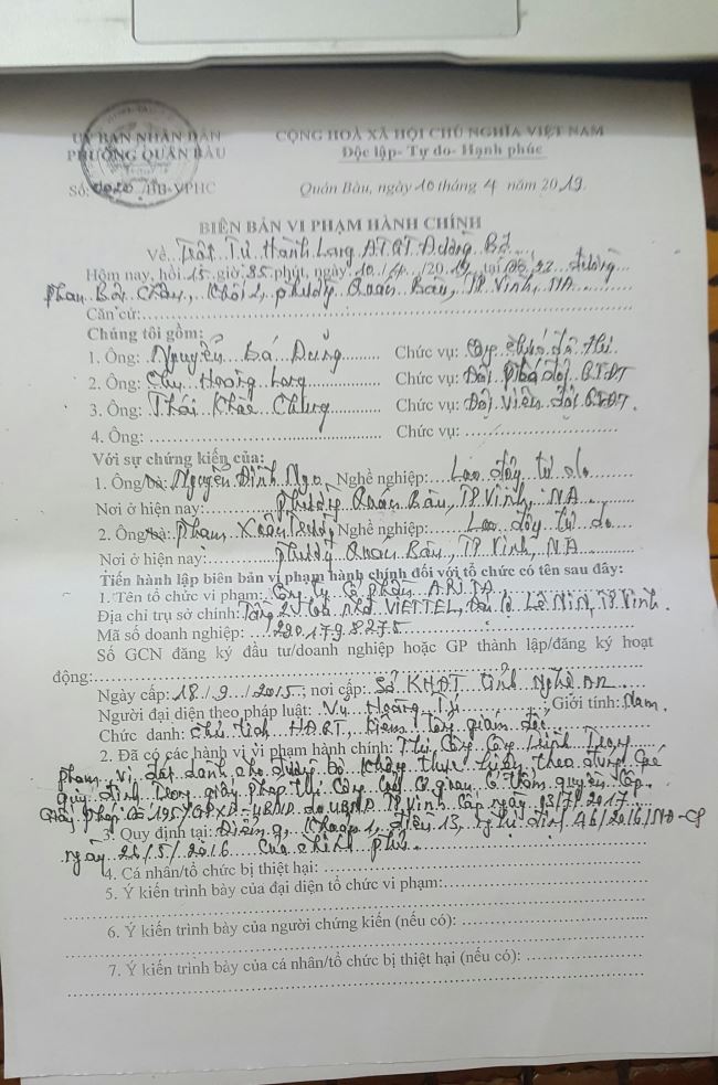 Biên bản vi phạm hành chính của UBND phường Quán Bàu xử