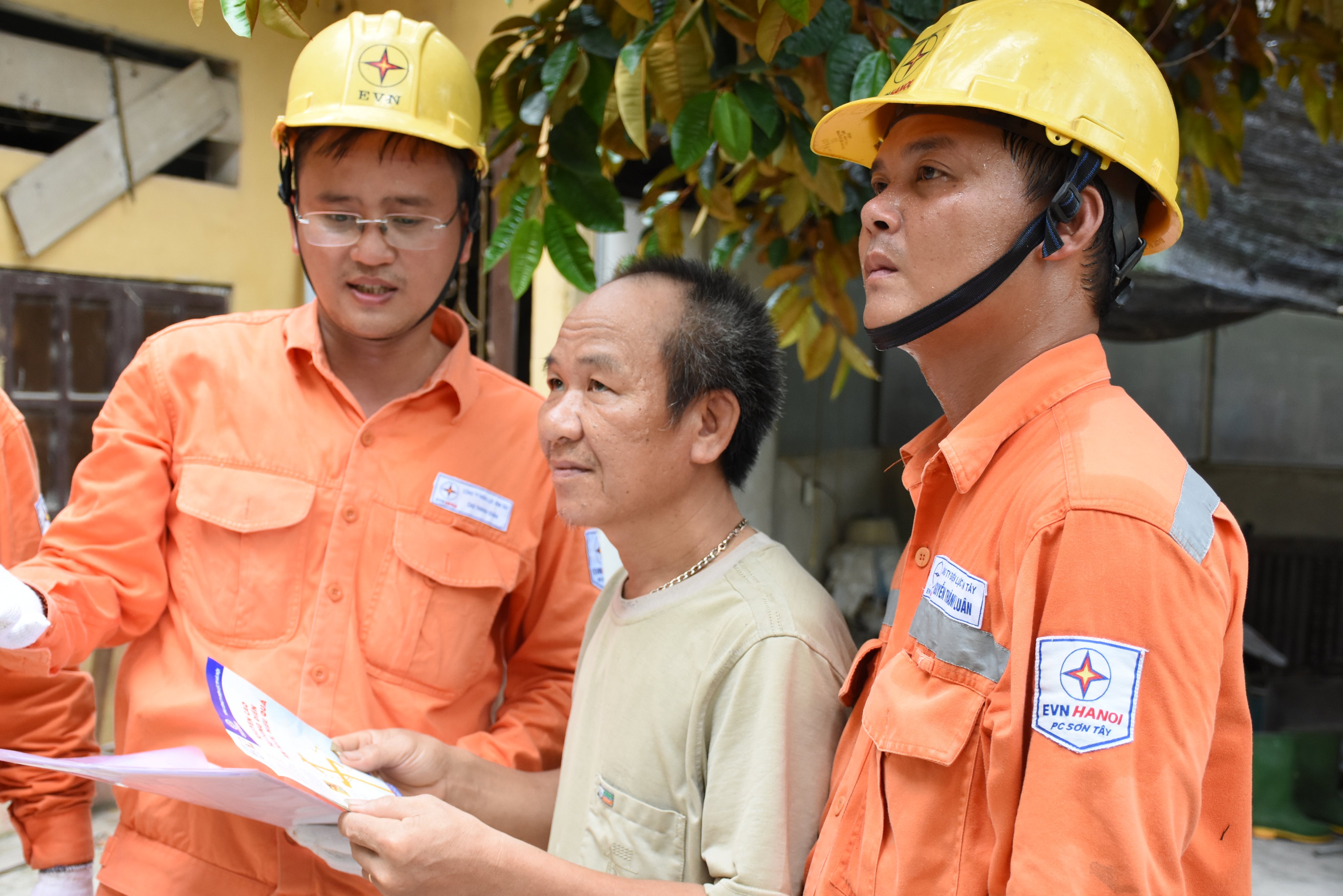 Nhân viên ngành điện hướng dẫn khách hàng về an toàn điện