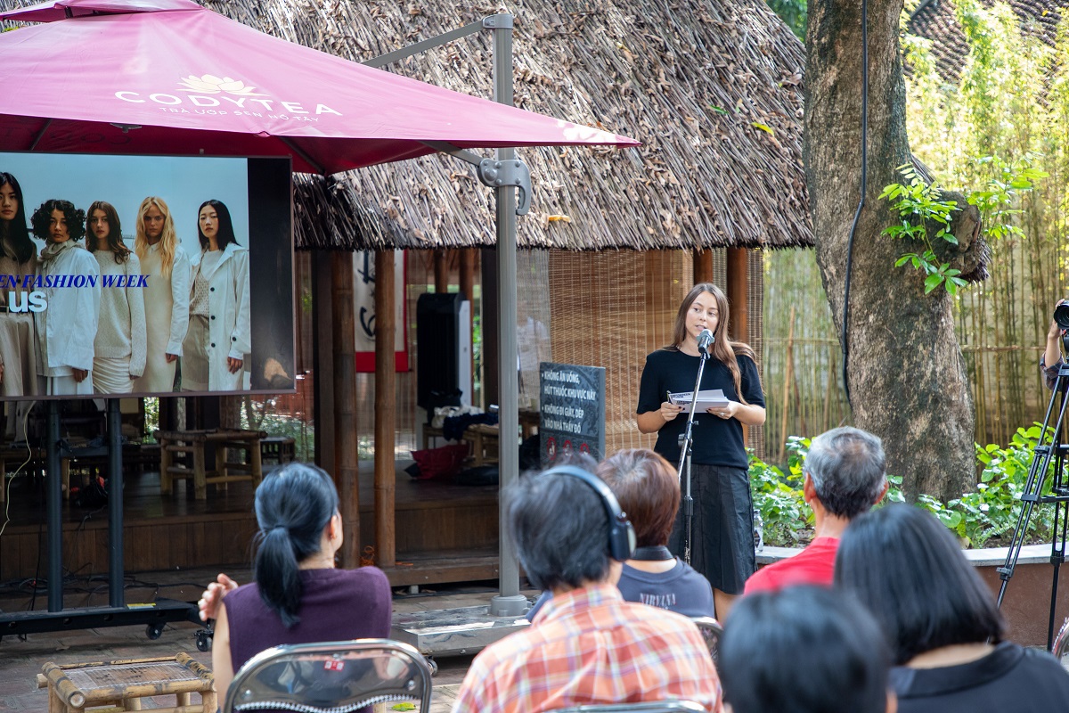 Buổi gặp gỡ là không gian giao lưu ý tưởng và kinh nghiệm phong phú từ các diễn giả đang tích cực đóng góp vào phong trào thời trang bền vững. Bà Evelina Danielsson Valladares, quản lý cấp cao về phát triển bền vững tại Tuần lễ thời trang Copenhagen (CPHFW) chia sẻ cách CPHFW trở thành một tổ chức tiên phong toàn cầu thông qua việc tích hợp các tiêu chuẩn môi trường và đạo đức vào khuôn khổ yêu cầu bền vững.