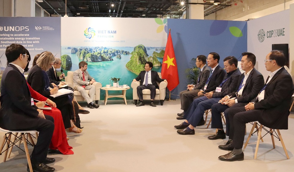 Trong khuôn khổ Hội nghị lần thứ 28 các bên tham gia Công ước khung của Liên Hợp Quốc về biến đổi khí hậu (COP28) tại Các Tiểu vương quốc Ả rập thống nhất, Bộ trưởng Bộ Tài nguyên và Môi trường Đặng Quốc Khánh đã tiếp và trao đổi với lãnh đạo Bộ Môi trường và Biến đổi khí hậu Canada (ECCC), Chương trình Phát triển Liên Hợp Quốc (UNDP) về hợp tác hỗ trợ Việt Nam phát triển các lĩnh vực liên quan đến môi trường, khí hậu.