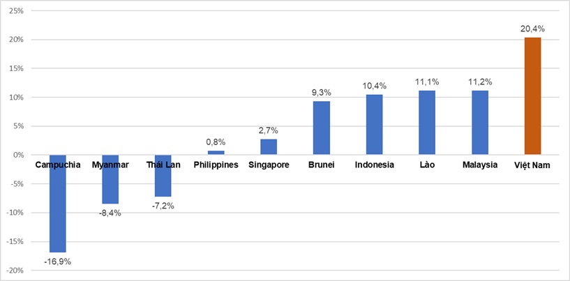 Theo đó, năm 2025, lượng khách quốc tế đến Việt Nam đạt mức tăng trưởng 20,4% so với năm 2024, cao hơn rất nhiều so với các điểm đến lớn khác như Malaysia (+11,2%), Indonesia (+10,4%) hay Singapore (+2,7%), Philippines (+0,8%). Trong khi đó, một số điểm đến láng giềng ghi nhận sự sụt giảm về lượng khách quốc tế như Thái Lan (-7,2%), Campuchia (-16,9%), Myanmar (-8%).