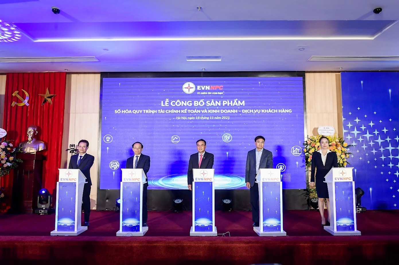 Các đại biểu thực hiện nghi thức công bố sản phẩm số hóa quy trình tài chính kế toán và kinh doanh – dịch vụ khách hàng của EVNNPC