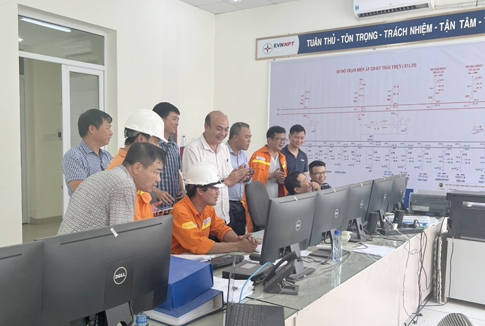 Các đơn vị tham gia dự án chứng kiến thời khắc đóng điện máy biến áp AT2 tại trạm biến áp 220kV Thái Thụy