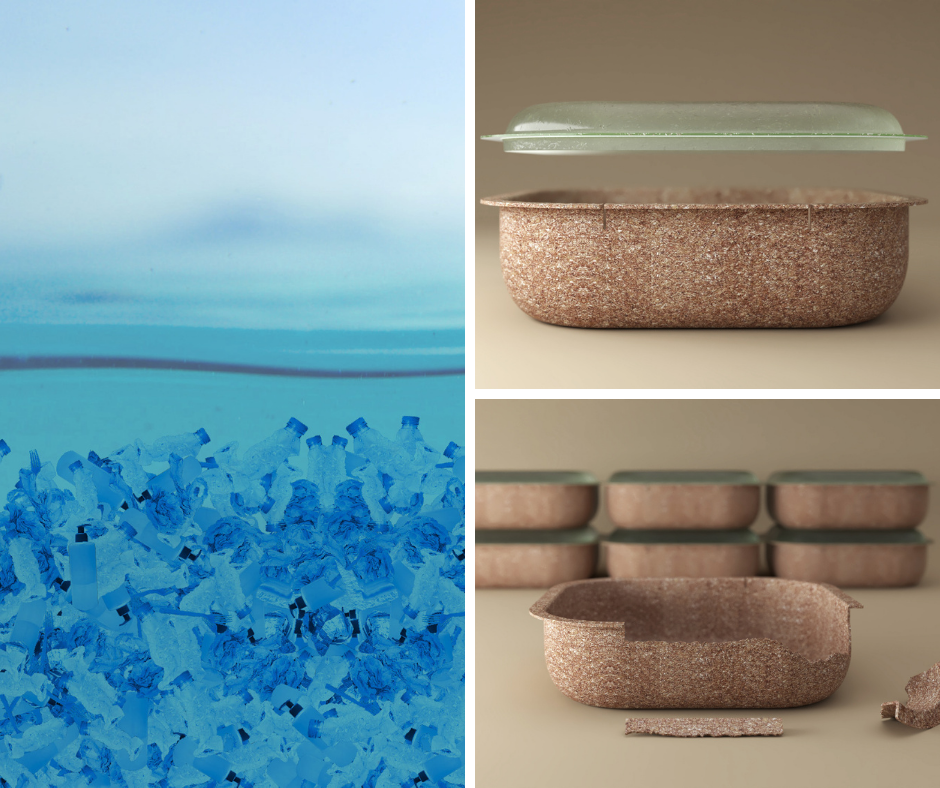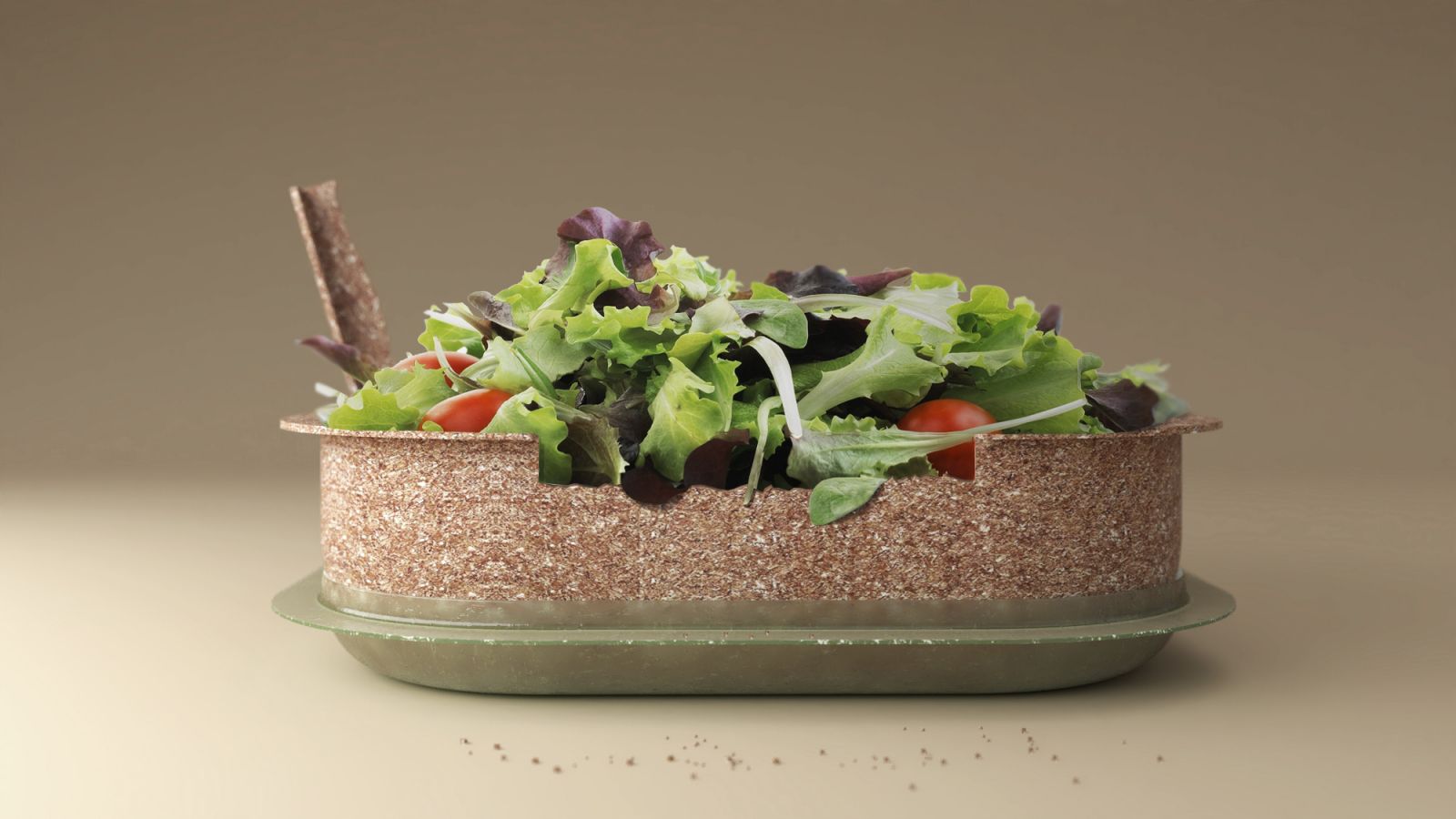 Hộp đựng Reuse của studio được làm từ vỏ lúa mì cho phần hộp chính và PHA (chất tổng hợp từ vi khuẩn) cho phần nắp.