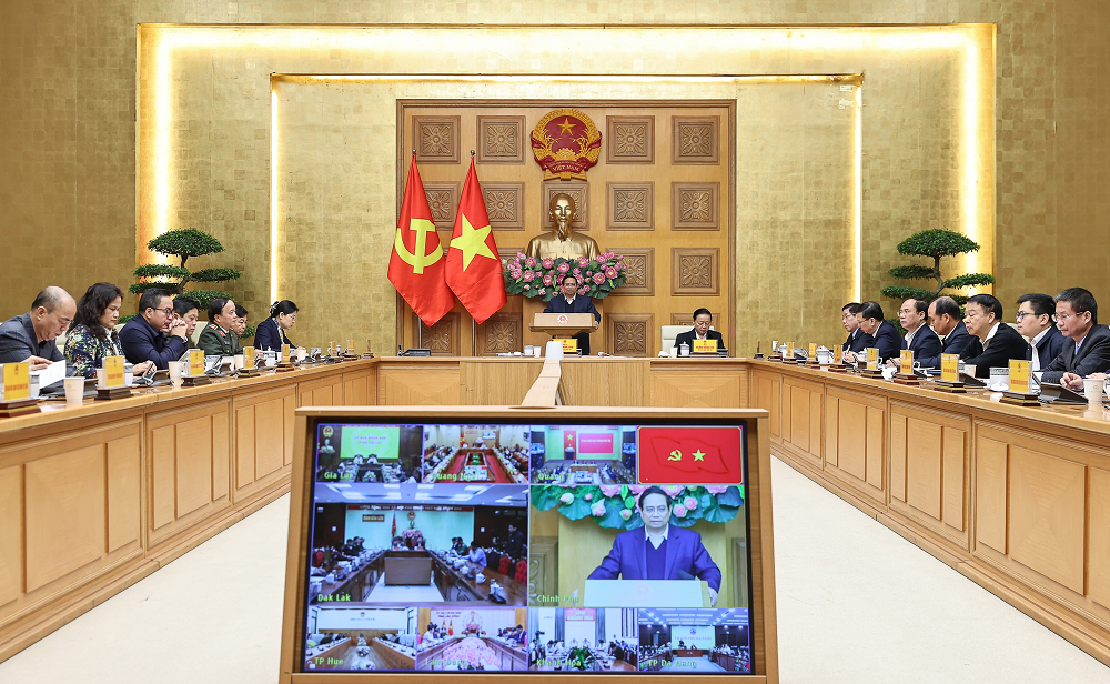 Thủ tướng Phạm Minh Chính chủ trì Hội nghị trực tuyến với các tỉnh, thành phố miền Trung về tình hình triển khai "Chiến dịch Quang Trung" thần tốc xây dựng lại, sửa chữa nhà ở cho các hộ dân có nhà bị thiệt hại do bão, lũ. (Ảnh: VGP)