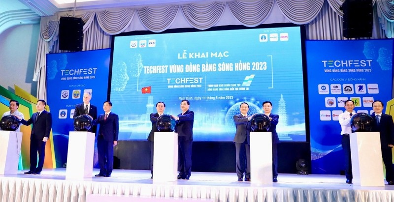 Các đại biểu thực hiện nghi thức khai mạc Ngày hội khởi nghiệp đổi mới sáng tạo vùng đồng bằng sông Hồng năm 2023