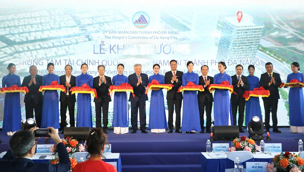 Phó Thủ tướng Thường trực Chính phủ Nguyễn Hòa Bình cùng các đại biểu cắt băng khai trương Trung tâm tài chính quốc tế Việt Nam tại Đà Nẵng