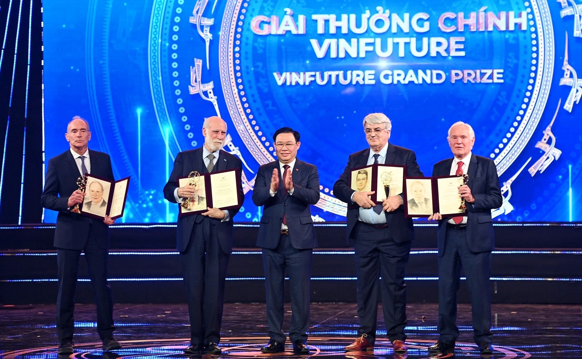 Chủ tịch Quốc hội Vương Đình Huệ (giữa) trao giải cho 4 tác giả đạt Giải thưởng Chính VinFuture 2022 trị giá 3 triệu USD