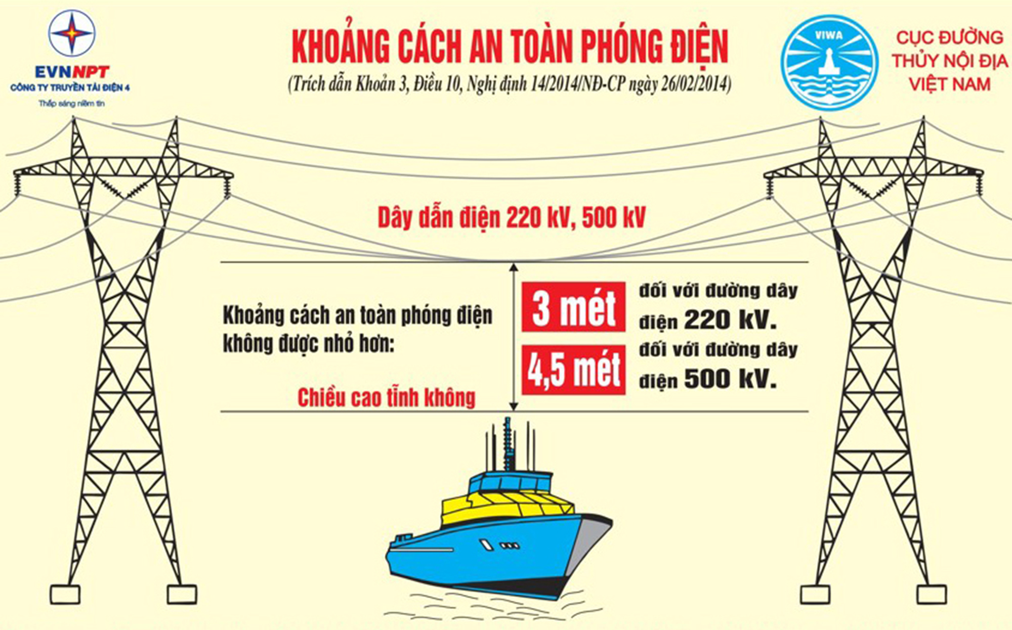 Tổng công ty Truyền tải điện Quốc gia và Cục Đường thủy nội địa Việt Nam đưa ra khuyến cáo khoảng cách an toàn phóng điện đối với các phương tiện tham gia giao thông đường thủy.