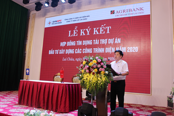 Phát biểu tại buổi lễ, ông Bùi Xuân Thành, Giám đốc Công ty Điện lực Lai Châu nhấn mạnh, việc ký kết hợp đồng tín dụng tài trợ dự án đầu tư xây dựng các công trình điện năm 2020 giữa Công ty Điện lực Lai Châu và Agribank – chi nhánh Lai Châu có ý nghĩa quan trọng góp phần đảm bảo cho các dự án thực hiện đúng tiến độ, giảm tổn thất điện năng, nâng cao độ tin cậy cung cấp điện, đảm bảo cung cấp điện chất lượng và dịch vụ tốt nhất cho các khách hàng, thúc đẩy sự phát triển kinh tế của địa phương. Công ty Điện lực Lai Châu cam kết đảm bảo mục đích vay vốn đúng pháp luật, đúng thẩm quyền, phù hợp với năng lực của đơn vị và đảm bảo thanh toán cho ngân hàng các khoản nợ đến hạn đúng theo hợp đồng.