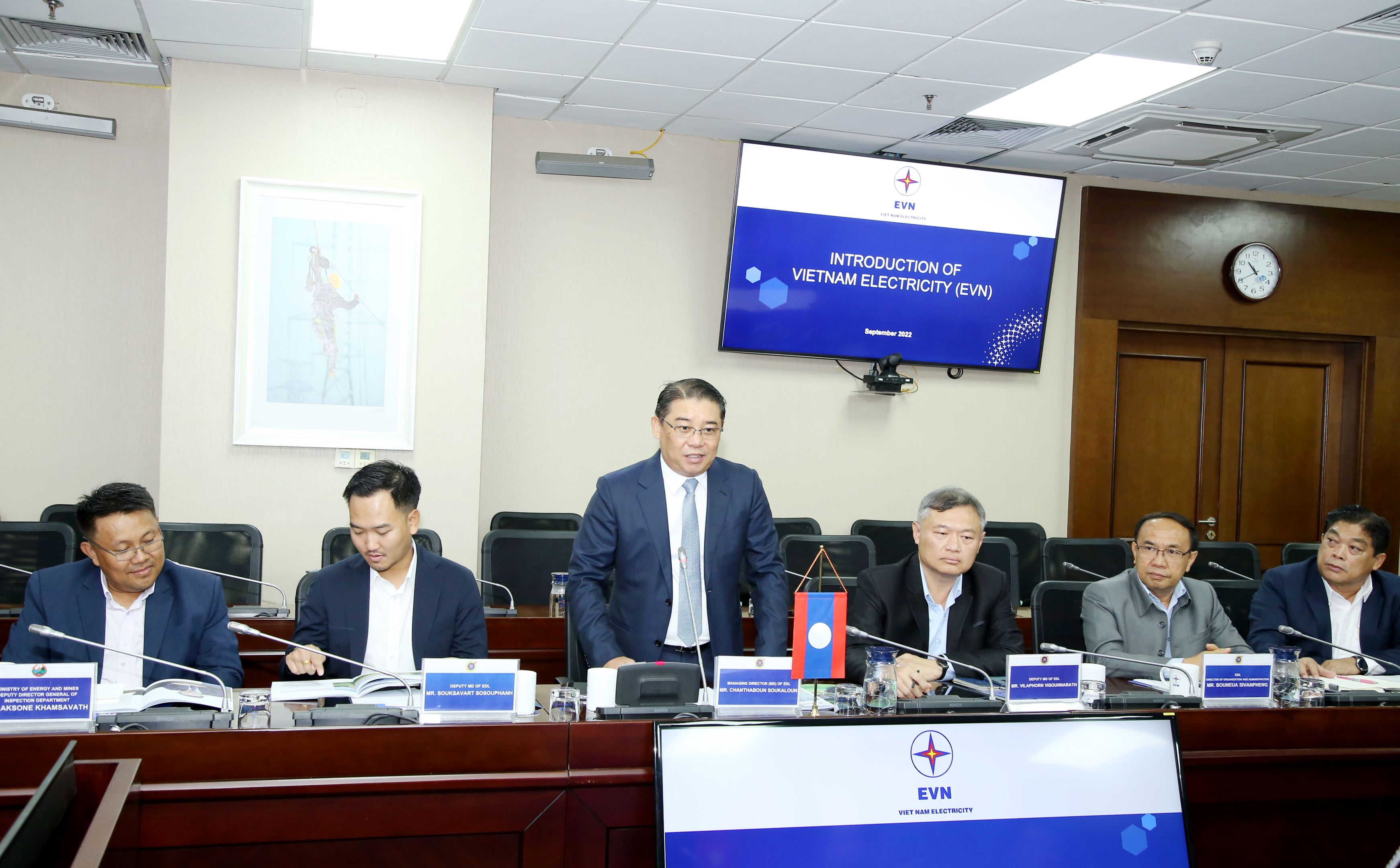 Ngày 8/9, tại Hà Nội, lãnh đạo Tập đoàn Điện lực Việt Nam (EVN) tiếp và làm việc với đoàn công tác của Tổng công ty Điện lực Lào (EDL), đại diện Bộ Năng Lượng và Mỏ Lào do ông Chanthaboun Soukaluon, Tổng giám đốc EDL làm trưởng đoàn.