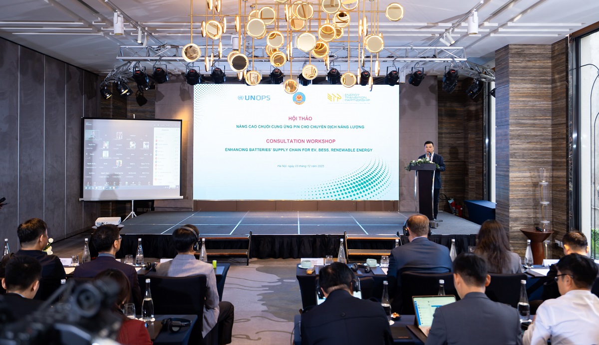 Ngày 3/12, tại Hà Nội, Văn phòng Dịch vụ dự án Liên Hợp Quốc (UNOPS) thông qua Đối tác Chuyển dịch năng lượng Đông Nam Á (ETP) phối hợp với Vụ Tài chính – Kinh tế ngành (Bộ Tài chính) tổ chức hội thảo “Nâng cao chuỗi cung ứng pin cho chuyển dịch năng lượng”.