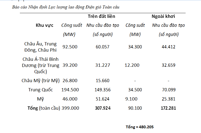 Hiện tại, thị trường đào tạo theo tiêu chuẩn GWO - được coi là tiêu chuẩn toàn cầu trong lĩnh vực đào tạo lực lượng lao động ngành điện gió có khả năng đáp ứng nhu cầu đào tạo của 150.000 lao động vào cuối năm 2021 và 200.000 lao động vào cuối năm 2022. Nhưng phân tích trong báo cáo Nhận định lực lượng lao động điện gió toàn cầu 2021 - 2025 cho thấy rằng, chúng ta sẽ cần đào tạo thêm ít nhất 280.000 công nhân để triển khai lắp đặt, vận hành các dự án điện gió với công suất 490 GW trong vòng 5 năm tới.