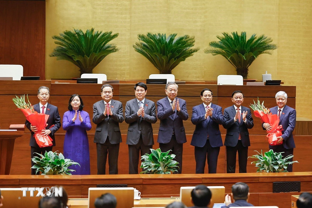 Tổng Bí thư Tô Lâm cùng các đồng chí Lãnh đạo Đảng, Nhà nước tặng hoa chúc mừng Chánh án Tòa án Nhân dân Tối cao Nguyễn Văn Quảng và Phó Chủ tịch Quốc hội Đỗ Văn Chiến vừa được Quốc hội bầu