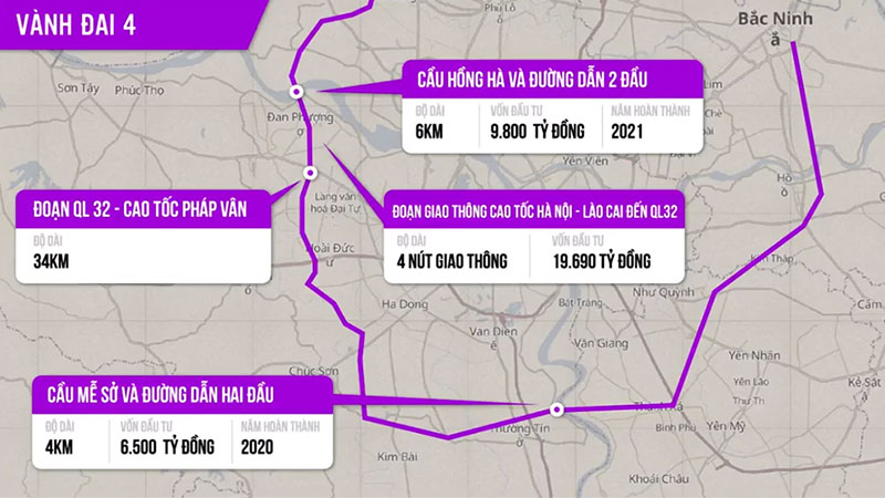 Đường vành đai 4 Hà Nội có tổng chiều dài tuyến 98 km đi qua 3 tỉnh, thành gồm: Hà Nội (54 km); Hưng Yên (23km); Bắc Ninh (21 km).