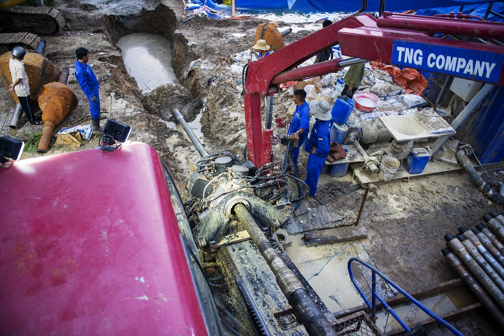 Để thực hiện công trình TNG đã áp dụng công nghệ khoan ngầm dẫn hướng bằng cách khoan mở rộng mũi khoan đạt đến đường kính yêu cầu (D1300) rồi tiến hành kéo ống qua sông. Trong quá trình khoan mở rộng đường kính, sẽ đồng thời bơm hoá chất tạo vách để chống sạt lở lỗ khoan.