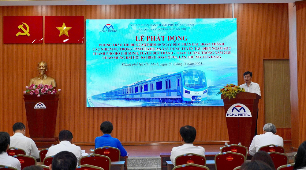 Ngày 3/11, Ban quản lý đường sắt đô thị TPHCM tổ chức Lễ phát động phong trào thi đua cao điểm 60 ngày đêm phấn đấu hoàn thành các nhiệm vụ trọng tâm của dự án xây dựng tuyến tàu điện ngầm số 2 (còn gọi là metro số 2, Bến Thành - Tham Lương) trong năm 2025, chào mừng Đại hội đại biểu toàn quốc lần thứ XIV của Đảng.