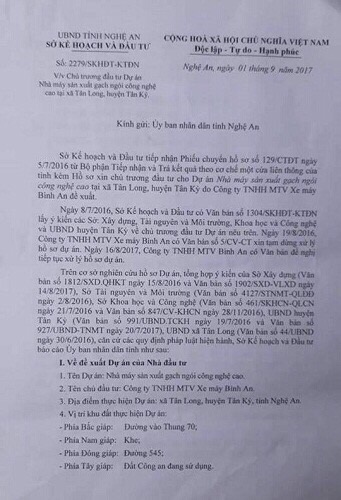 Chủ trương đầu tư dự án nhà máy sản xuất gạch ngói công nghệ cao của Sở kế hoạch và Đầu tư trình UBND tỉnh Nghệ An
