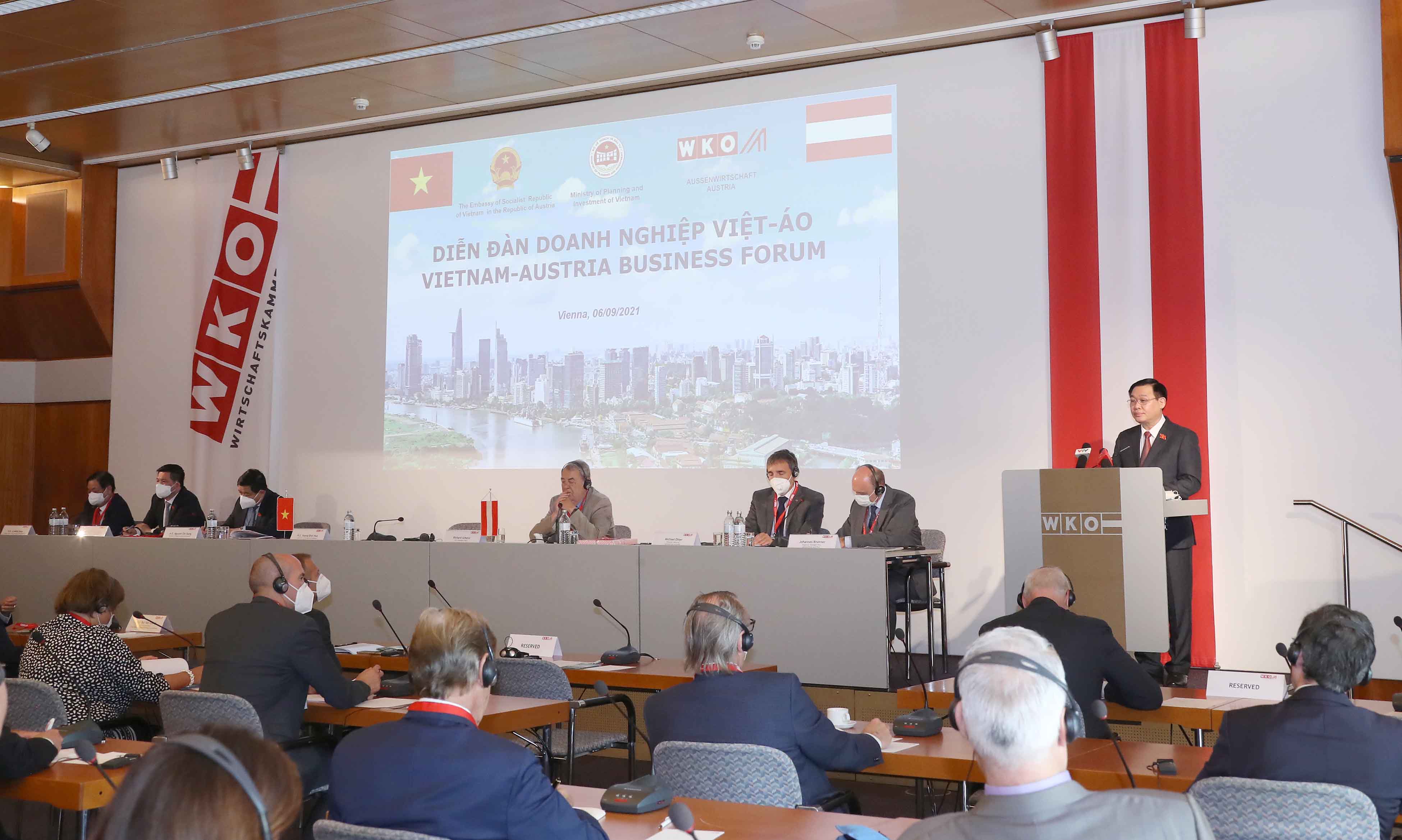 Phát biểu tại diễn đàn, Chủ tịch Quốc hội bày tỏ niềm vui mừng được tham dự diễn đàn và khẳng định Áo luôn là đối tác quan trọng của Việt Nam về mọi mặt, đặc biệt trong xuất nhập khẩu. Cụ thể, theo Chủ tịch Quốc hội Vương Đình Huệ, năm 2021 là năm có ý nghĩa đặc biệt quan trọng đối với Việt Nam, là năm đầu tiên thực hiện Chiến lược phát triển kinh tế - xã hội 10 năm (2021 – 2030) và Kế hoạch phát triển kinh tế - xã hội 5 năm (2021 – 2025). Việt Nam đã đưa ra quan điểm phát triển kinh tế - xã hội trong giai đoạn tới, đó là phát triển nhanh và bền vững, chủ yếu dựa vào khoa học công nghệ, đổi mới sáng tạo và chuyển đổi số; hoàn thiện thể chế kinh tế thị trường; khơi dậy khát vọng phát triển đất nước phồn vinh, hạnh phúc, ý chí tự cường và phát huy sức mạnh đoàn kết; xây dựng nền kinh tế tự chủ trên cơ sở làm chủ công nghệ, chủ động và tích cực hội nhập quốc tế, phát huy nội lực là yếu tố quyết định gắn với ngoại lực và sức mạnh thời đại; gắn kết phát triển kinh tế xã hội, môi trường với quốc phòng, an ninh, đối ngoại.