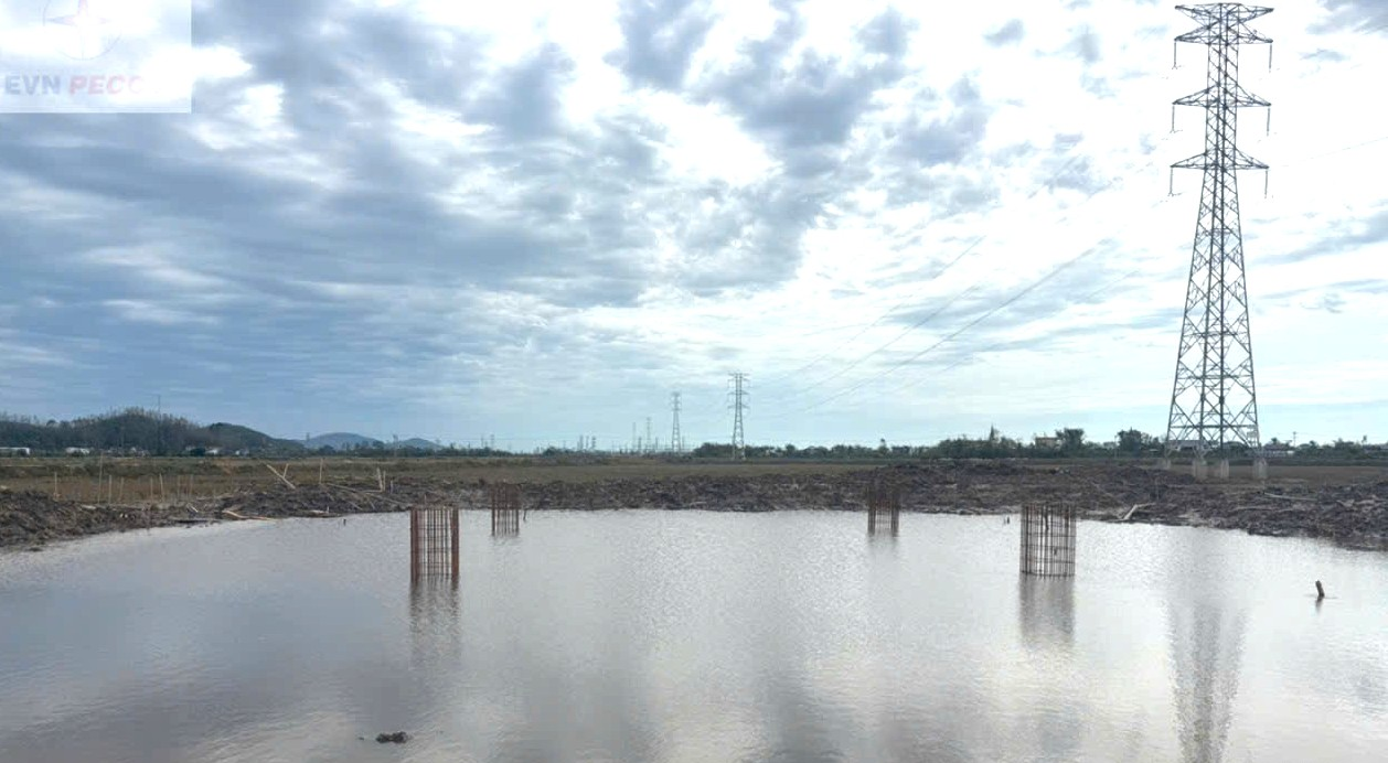 Nhiều vị trí móng bị ngập nước do ảnh hưởng bởi mưa bão gây khó khăn trong công tác thi công