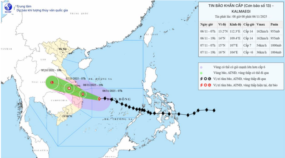Bản đồ dự báo quỹ đạo và cường độ bão số 13 (Kalmaegi) do Trung tâm Dự báo khí tượng thủy văn quốc gia phát lúc 8 giờ ngày 6/11/2025