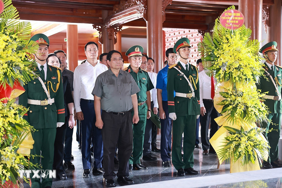 Thủ tướng Chính phủ Phạm Minh Chính và đoàn công tác đã đặt vòng hoa, dâng hương tưởng niệm các anh hùng liệt sỹ tại Nghĩa trang Liệt sỹ Quốc gia Đường 9 - nơi yên nghỉ vĩnh hằng của hơn 10.800 anh hùng liệt sỹ của cả nước từng chiến đấu, phục vụ chiến đấu và anh dũng hy sinh trên Mặt trận Đường 9, chiến trường Quảng Trị và đất nước bạn Lào trong suốt cuộc kháng chiến chống Mỹ cứu nước giành độc lập dân tộc.