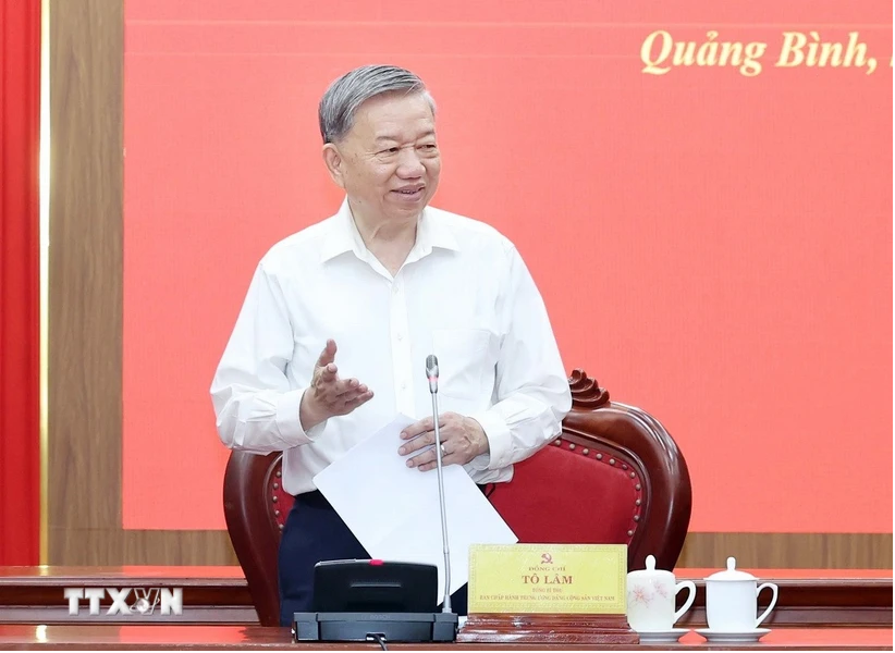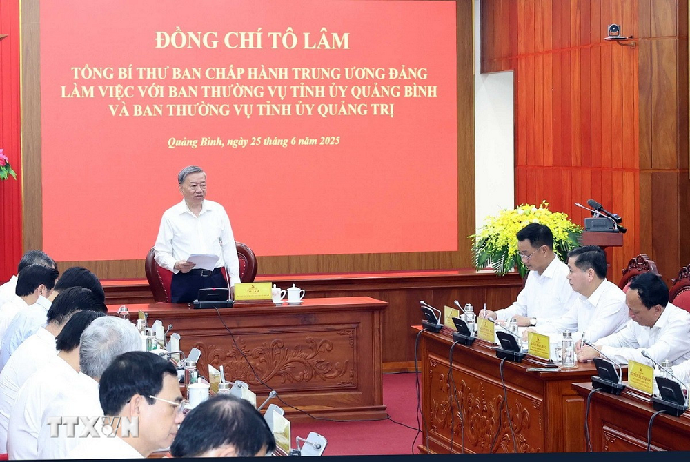 Sáng 25/6, tại Quảng Bình, Tổng Bí thư Tô Lâm và Đoàn công tác của Trung ương đã làm việc với Ban Thường vụ Tỉnh ủy Quảng Bình và Ban Thường vụ Tỉnh ủy Quảng Trị về kết quả triển khai thực hiện các nghị quyết, kết luận của Trung ương và một số nhiệm vụ trọng tâm phát triển kinh tế - xã hội, đảm bảo quốc phòng, an ninh trên địa bàn tỉnh Quảng Bình, Quảng Trị.