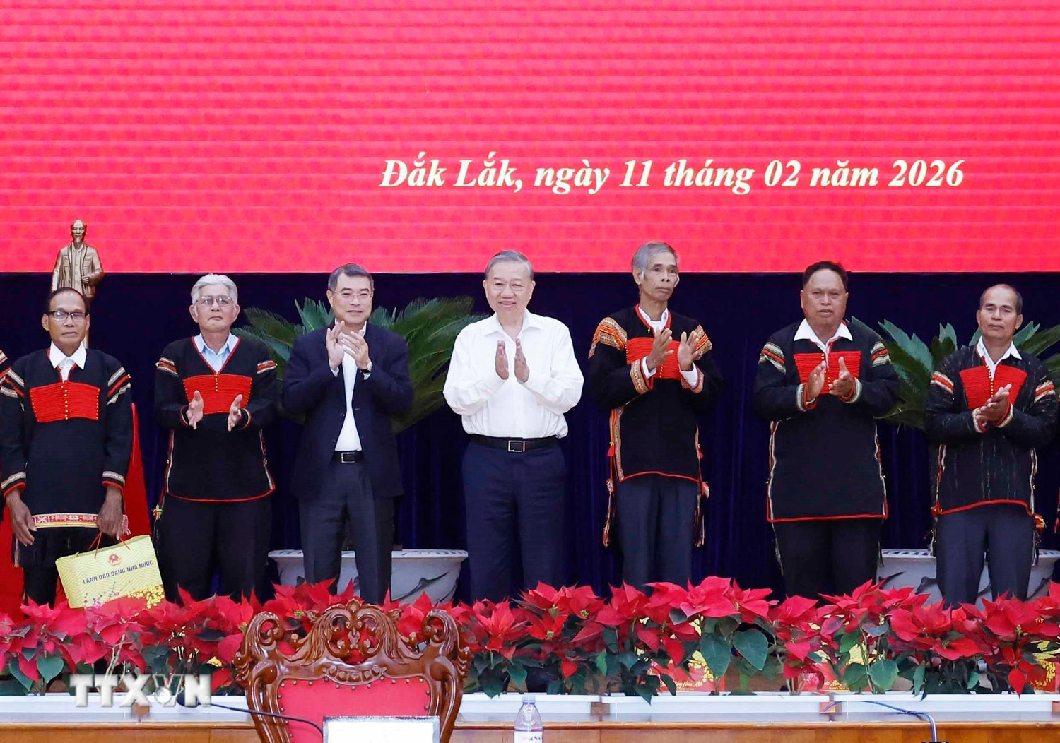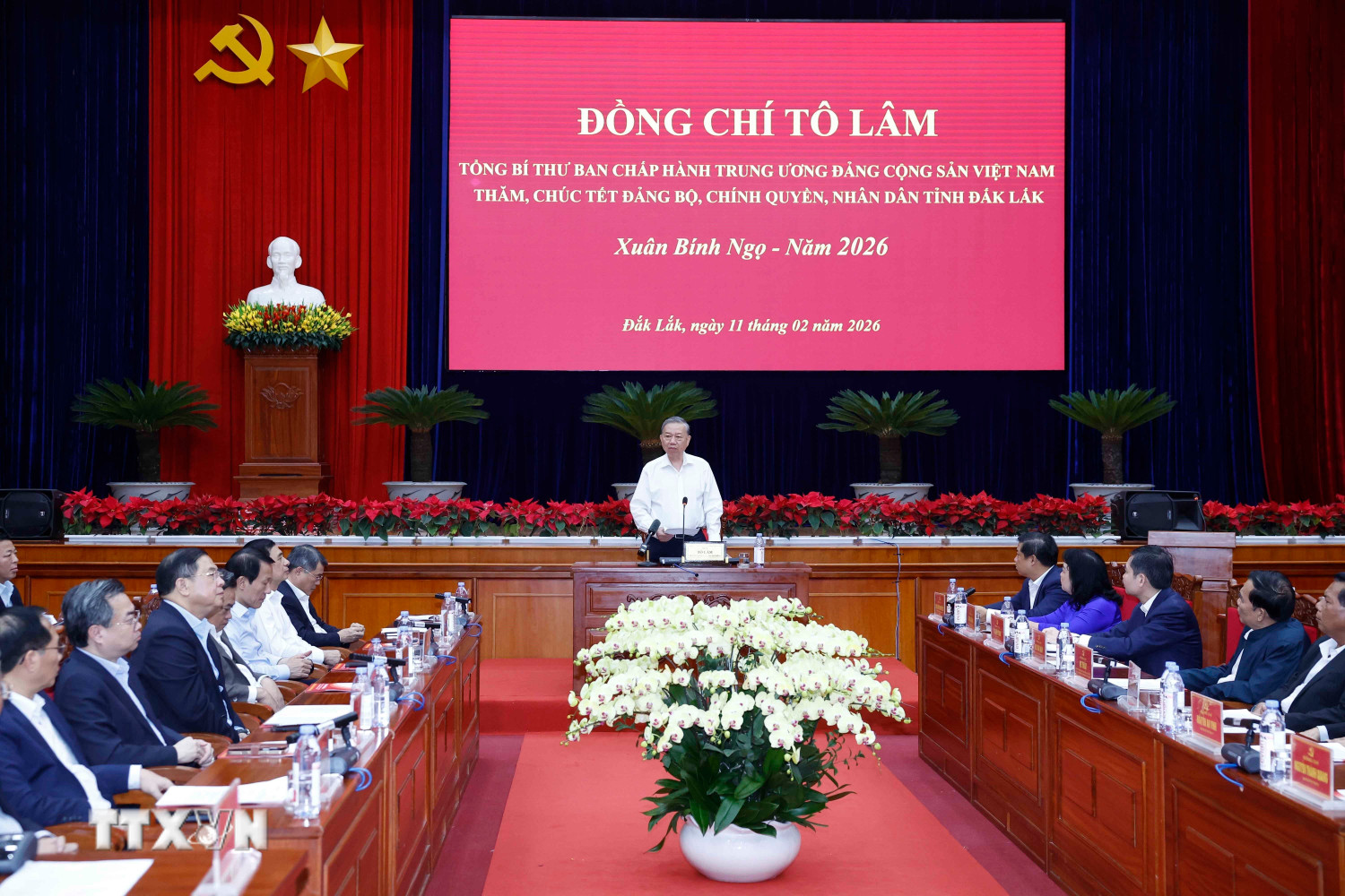 Phát biểu với Đảng bộ, chính quyền, nhân dân tỉnh Đắk Lắk, Tổng Bí thư Tô Lâm ghi nhận, những kết quả đạt được trong năm 2025 cho thấy bản lĩnh, sự nỗ lực rất lớn và tinh thần trách nhiệm cao của Đảng bộ, chính quyền và nhân dân tỉnh Đắk Lắk; tin tưởng một vùng đất giàu truyền thống cách mạng, có chiều sâu văn hóa và cộng đồng các dân tộc đoàn kết, Đắk Lắk bước vào năm 2026 với khí thế, quyết tâm rất cao cho một nhiệm kỳ mới.