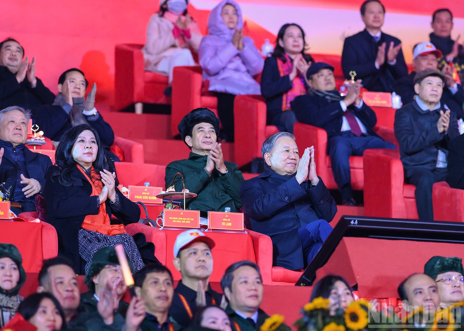 Đồng chí Tổng Bí thư Tô Lâm dự chương trình. Cùng dự chương trình, có nguyên Tổng Bí thư Nông Đức Mạnh, các đồng chí Ủy viên Bộ Chính trị: Thủ tướng Phạm Minh Chính; Chủ tịch Quốc hội Trần Thanh Mẫn; Thường trực Ban Bí thư Trần Cẩm Tú; Chủ tịch Ủy ban Trung ương Mặt trận Tổ quốc Việt Nam Bùi Thị Minh Hoài... Ngoài ra, còn có đông đảo các đồng chí lãnh đạo Đảng, Nhà nước, các ban, bộ, ngành, cơ quan Trung ương và địa phương...