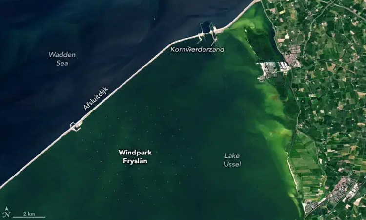 Trong ảnh chụp hồi tháng 7 của thiết bị Operational Land Imager (OLI) trên vệ tinh Landsat 8, các turbine đặt ở khoảng cách đều nhau của trang trại Windpark Fryslân nhô lên trên mặt hồ IJssel. Cách bố trí turbine theo hình lục giác nhằm giảm tối đa mức độ cản trở tầm nhìn đường chân trời. Đập Afsluitdijk dài 32 km cũng chống lũ và ngăn cách hồ nước với biển Wadden, cũng có thể nhìn thấy rõ trong ảnh.