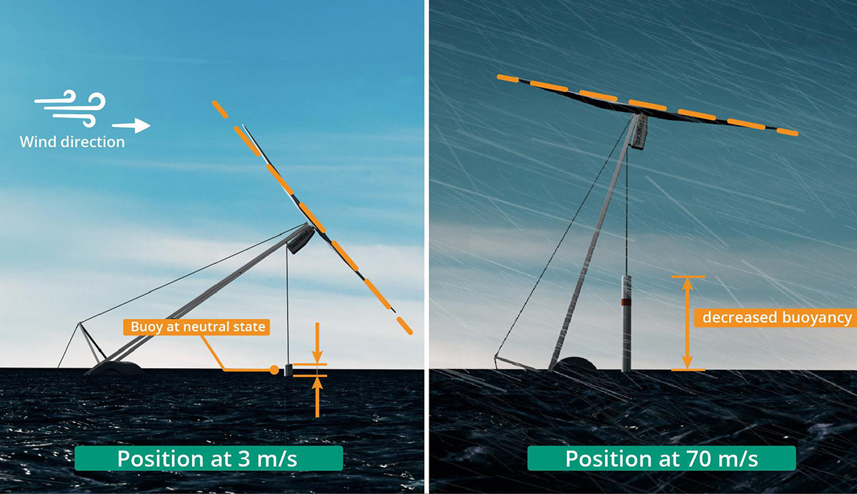 Do đó, ở tốc độ gió cao, cánh quạt gần như nằm ngang, song song với đường chân trời, hạn chế khả năng bị gió quay nhanh hơn. Và khi điều này xảy ra, phao được nâng lên khỏi mặt nước, trở thành vật dằn (ballast) chống chọi với lực nâng của cánh quạt, giúp giảm sức căng cho các mỏ neo dưới đáy biển, ngăn turbine bay lên khỏi vị trí.