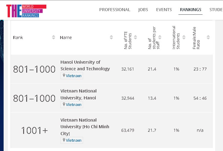 Ba trường đại học Việt Nam có mặt trong danh sách 1.400 trường đại học trong xếp hạng của World University Rankings (xếp hạng đại học thế giới - WUR) Times Higher Education 2020 (THE 2020) gồm Đại học Bách Khoa Hà Nội, Đại học Quốc gia Hà Nội và Đại học Quốc gia TPHCM.