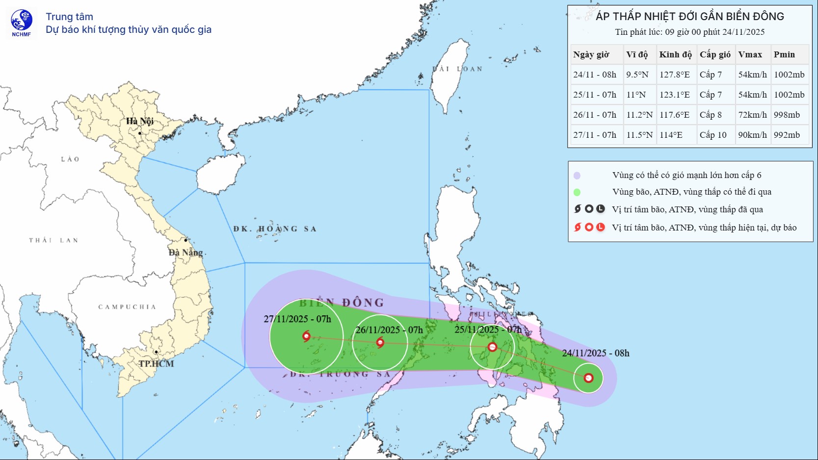 Bản đồ dự báo quỹ đạo và cường độ áp thấp nhiệt đới do Trung tâm Dự báo khí tượng thủy văn quốc gia phát lúc 9 giờ ngày 24/11/2025