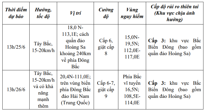 Trung tâm Dự báo khí tượng thủy văn quốc gia thông tin, hồi 13 giờ, vị trí tâm áp thấp nhiệt đới ở vào khoảng 16,0 độ Vĩ Bắc; 116,2 độ Kinh Đông, cách quần đảo Hoàng Sa khoảng 500km về phía Đông Đông Nam. Sức gió mạnh nhất vùng gần tâm áp thấp nhiệt đới mạnh cấp 6 (39 - 49km/h), giật cấp 8; di chuyển theo hướng Tây Bắc với tốc độ khoảng 15km/h.